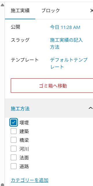 上記画像の「施工実績」のタブは、この記事全体についての設定項目。