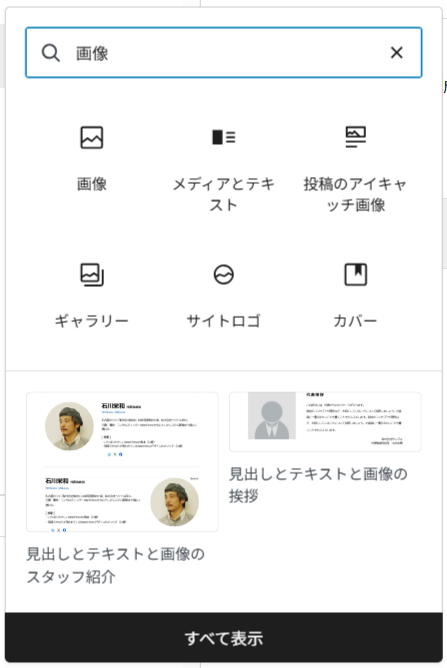どのような「要素」を入れるか。を選択できる。「検索」欄に「画像」と打ち込むと、画像に関するものが出てくる。