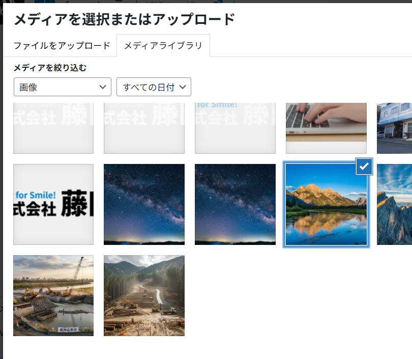 アップロード済であれば「メディアライブラリ」から、目的の画像を選択。