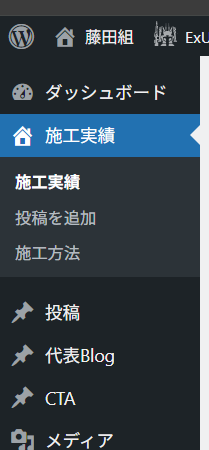 ①管理画面のメニューから、「施工実績」を選択し、「投稿を追加」から新規記事を作成